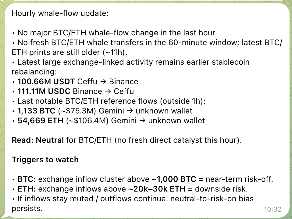 [Run an hourly BTC/ETH whale-flow check focused on major transfers and exchange flows. Use web sources/tools available (e.g., Whale Alert dashboard and reputable trackers). Return a concise update with: (1) top 3-5 notable flows in the last hour, (2) quick interpretation (risk-on/risk-off/neutral), (3) any actionable watch levels for BTC/ETH. If there is no meaningful flow, say "No major whale-flow change in the last hour." Keep it under 8 bullets.]